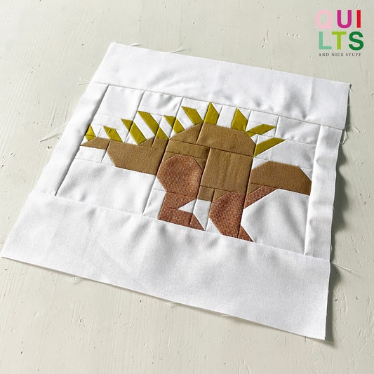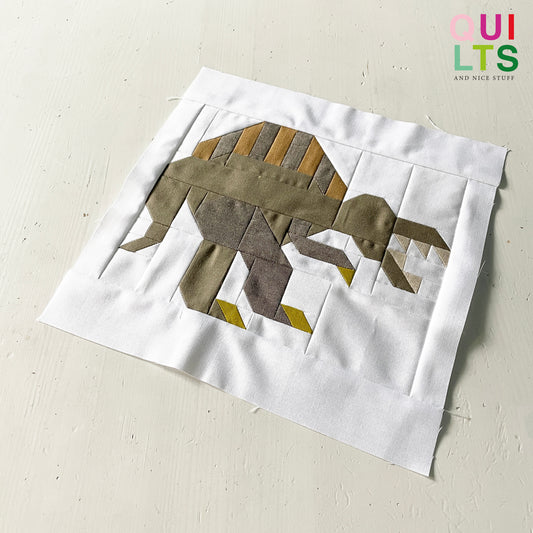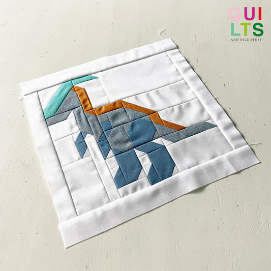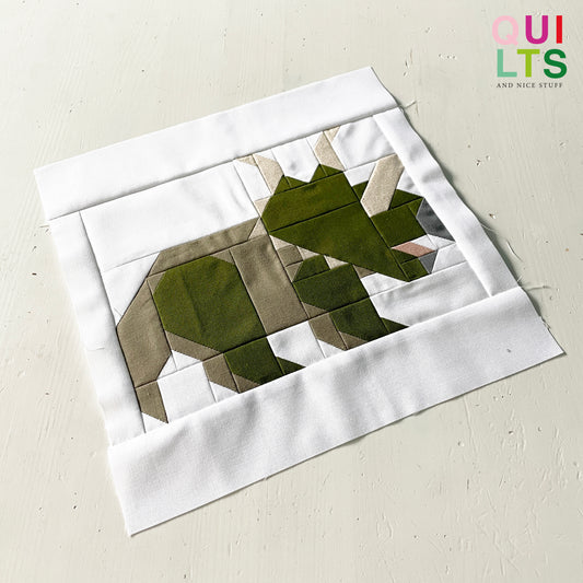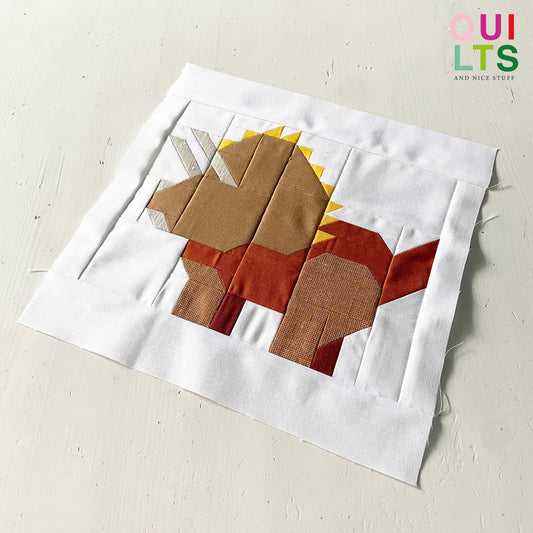 Die Dinosaurier-Quiltblöcke werden auf traditionelle Weise genäht. Das bedeutet, dass alle Schnittteile nur aus Quadraten und Rechtecken bestehen, die Du gemäß der bebilderten Schritt-für-Schritt-Anleitung zusammennähst – ganz ohne komplizierte Rundungen oder "Foundation Paper Piecing". Diese Anleitungen eignen sich daher auch hervorragend für Nähanfänger!