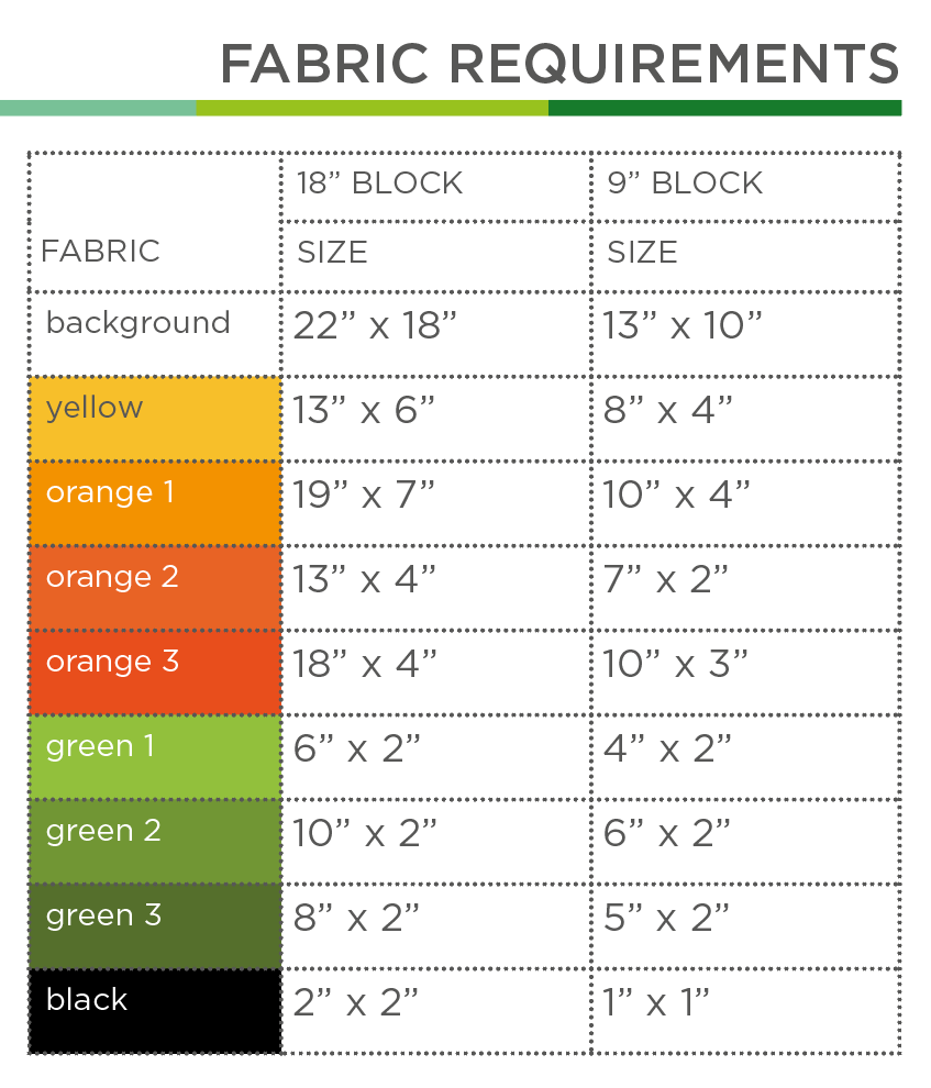 - Cutting instruction and fabric requirements (only sashing, borders, backing) and diagram for 2 quilt assemblies per block size