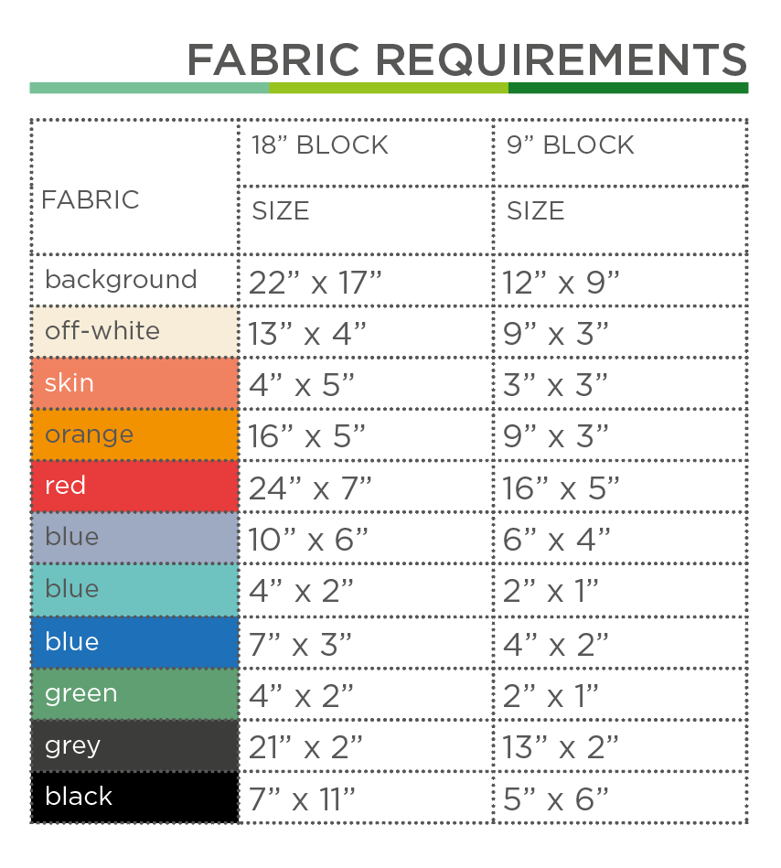 - Cutting instruction and fabric requirements (only sashing, borders, backing) and diagram for 3 quilt assemblies per block size
