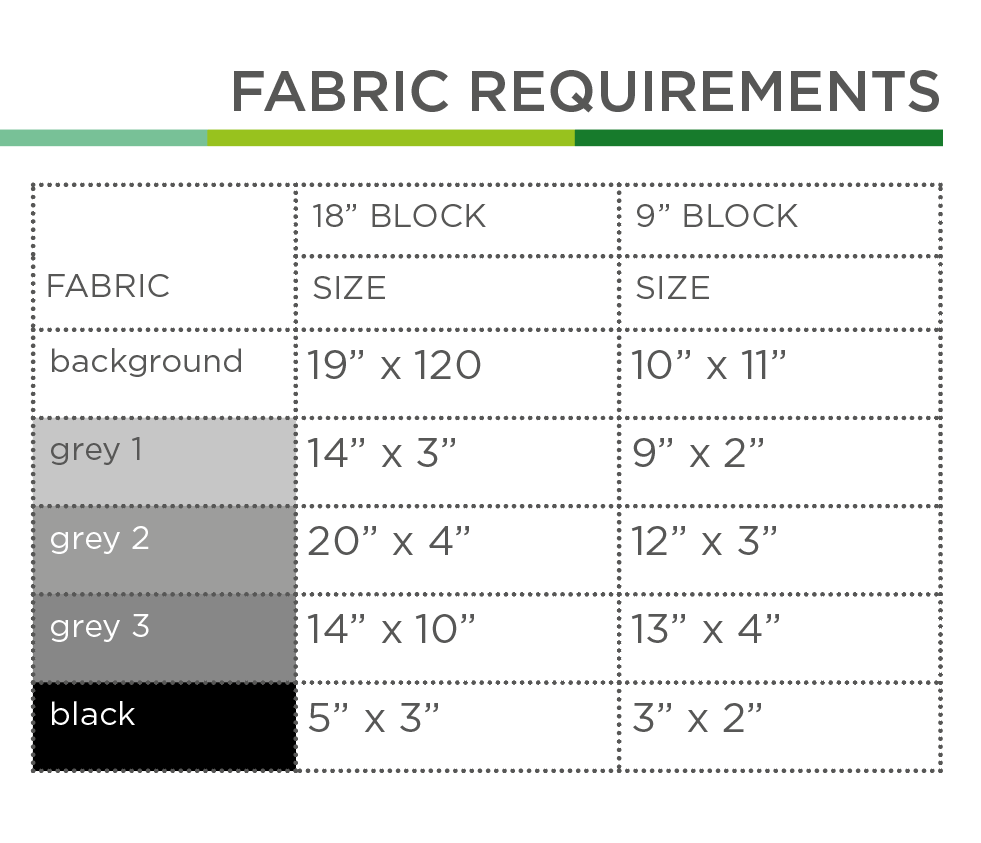 - Zuschnitt und Stoffbedarf (nur Sashing, Border, Backing) und Diagramm für 2 Quilt-Zusammenstellungen pro Blockgröße