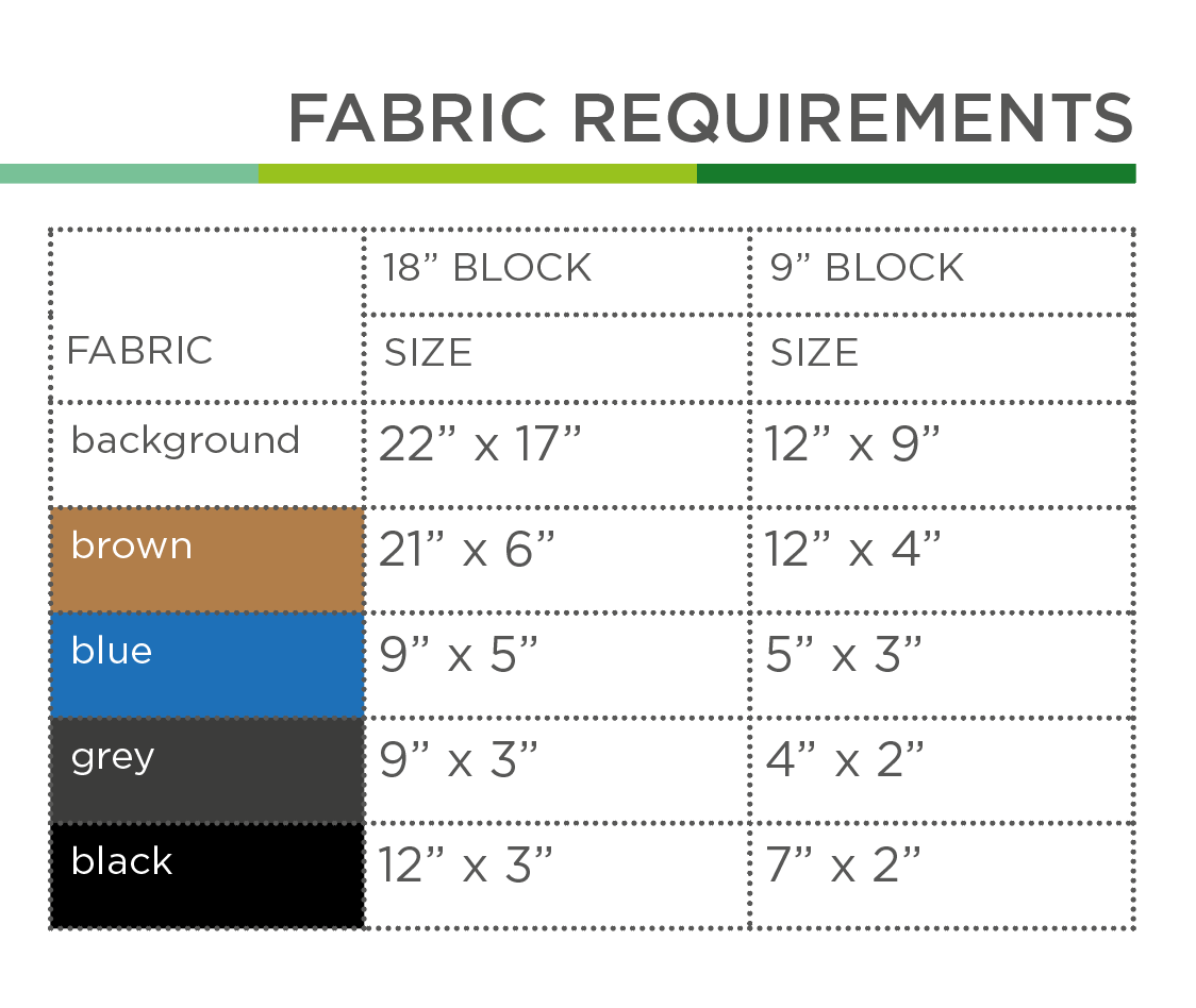 - Zuschnitt und Stoffbedarf (nur Sashing, Border, Backing) und Diagramm für 2 Quilt-Zusammenstellungen pro Blockgröße