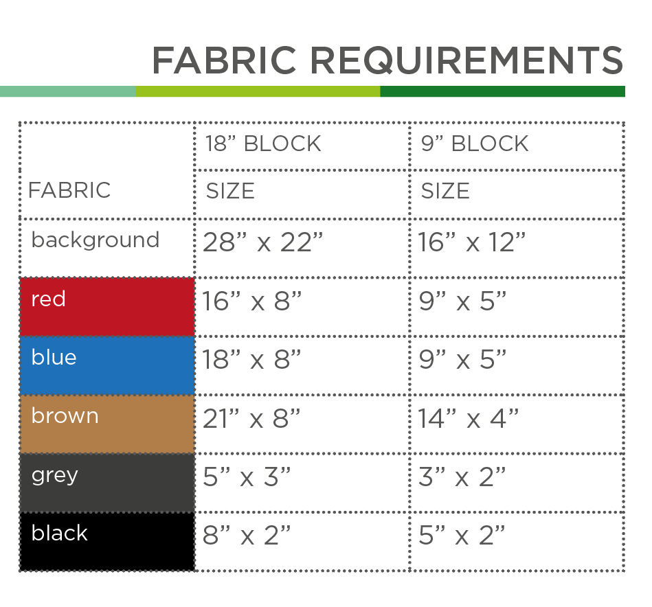- Zuschnitt und Stoffbedarf (nur Sashing, Border, Backing) und Diagramm für 2 Quilt-Zusammenstellungen pro Blockgröße