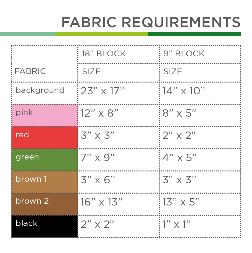 - Zuschnitt und Stoffbedarf (nur Sashing, Border, Backing) und Diagramm für 2 Quilt-Zusammenstellungen pro Blockgröße