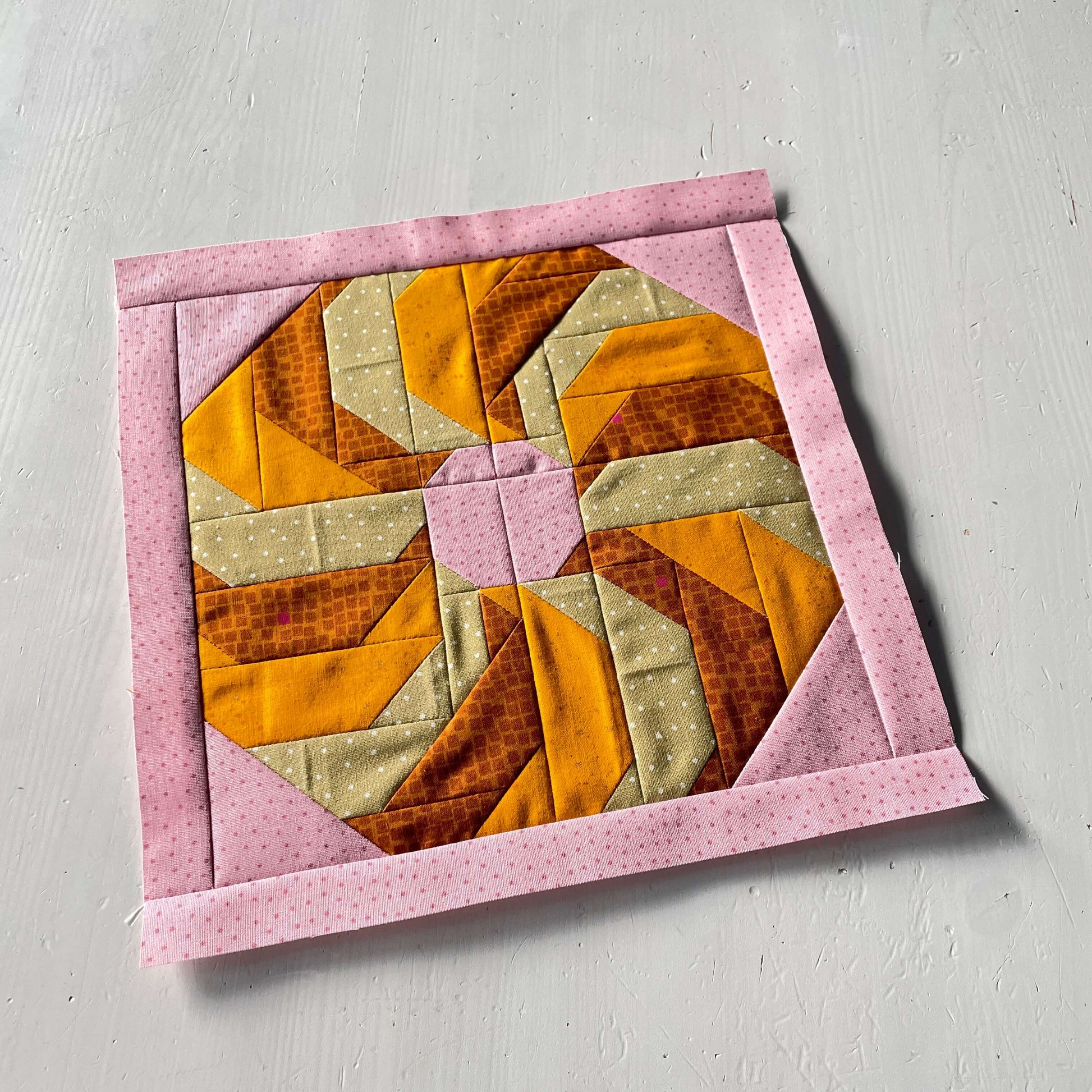 Genäht wird der Quilt Block auf traditionelle Art, nur aus Quadraten und Rechtecken. Kein “Foundation Paper Piecing”, also keine Papiervorlage wird verwendet und es müssen keine Rundungen genäht werden.