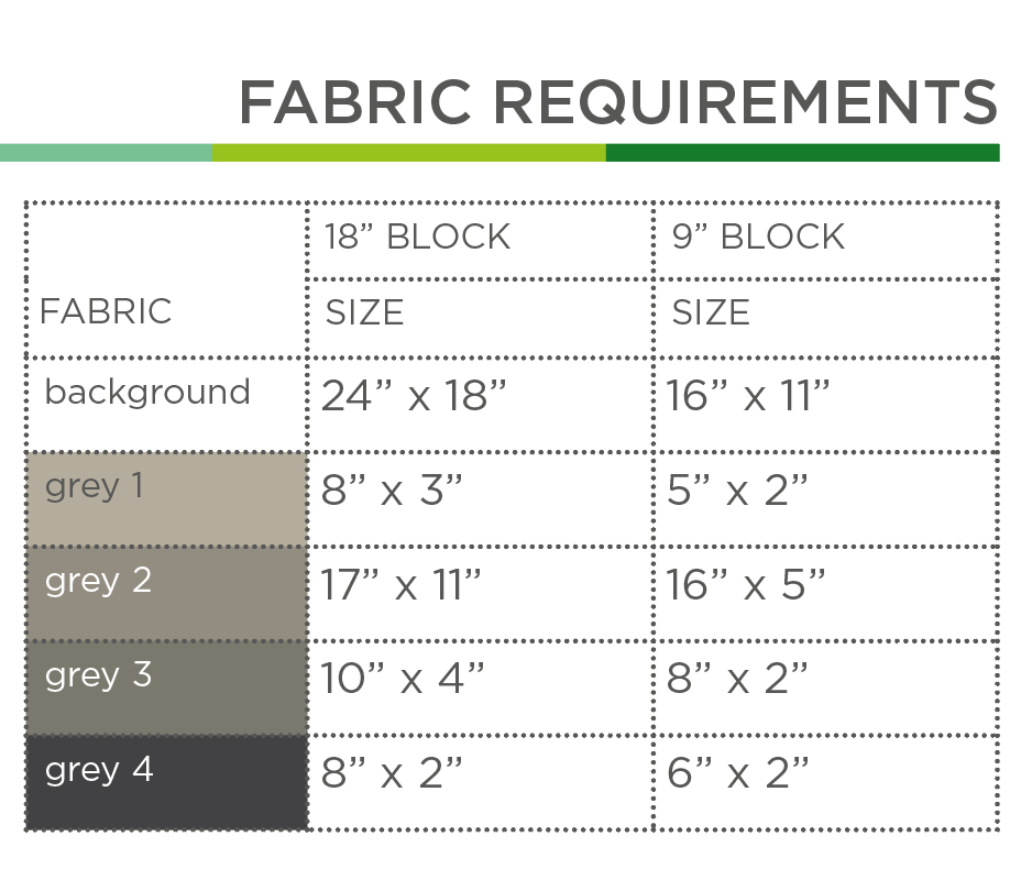 - Zuschnitt und Stoffbedarf (nur Sashing, Border, Backing) und Diagramm für 2 Quilt-Zusammenstellungen pro Blockgröße