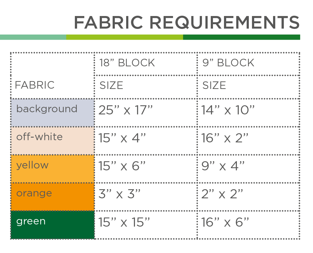 - Zuschnitt und Stoffbedarf (nur Sashing, Border, Backing) und Diagramm für 2 Quilt-Zusammenstellungen pro Blockgröße