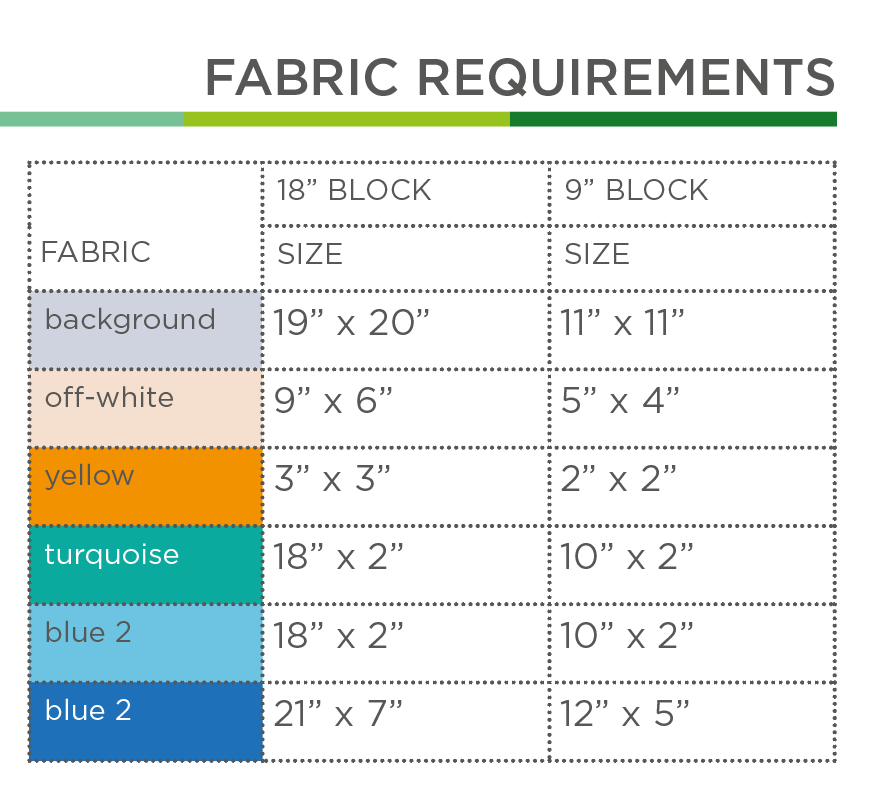 - Zuschnitt und Stoffbedarf (nur Sashing, Border, Backing) und Diagramm für 2 Quilt-Zusammenstellungen pro Blockgröße