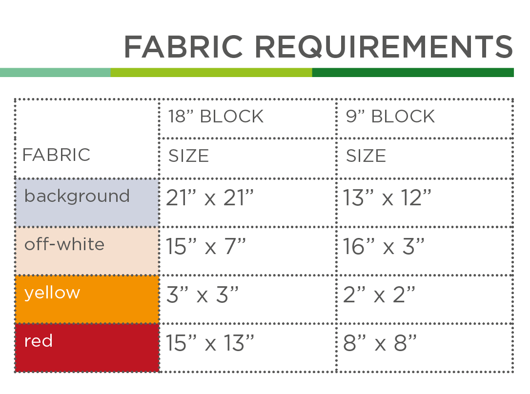 - Zuschnitt und Stoffbedarf (nur Sashing, Border, Backing) und Diagramm für 2 Quilt-Zusammenstellungen pro Blockgröße